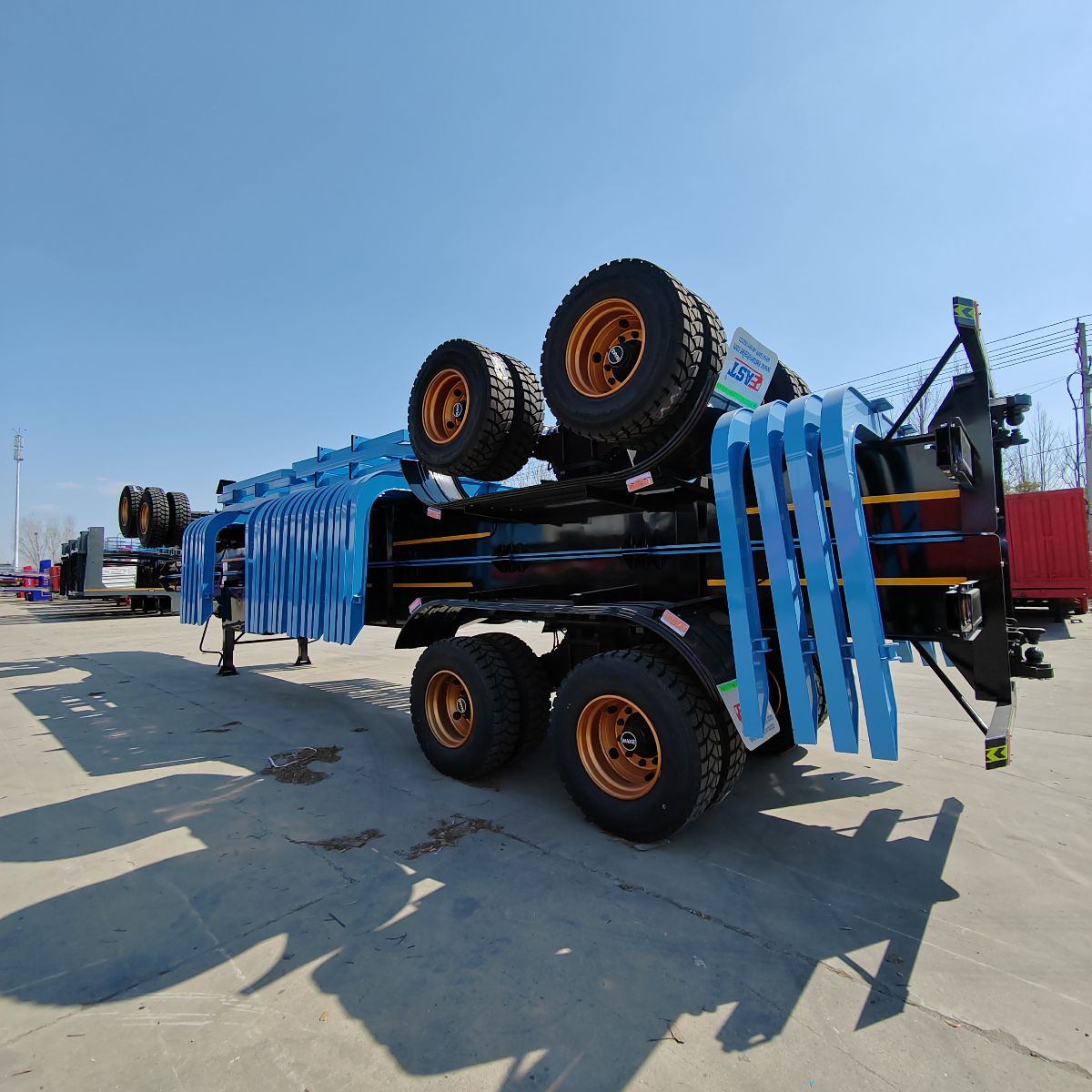 There are multiple sets of detachable or foldable pillars on both sides of the vehicle to prevent the wood from sliding sideways; The tail is equipped with a rotating or hydraulic lifting carrier (commonly known as a “goose neck”), which prevents long wood from slipping through physical barriers.